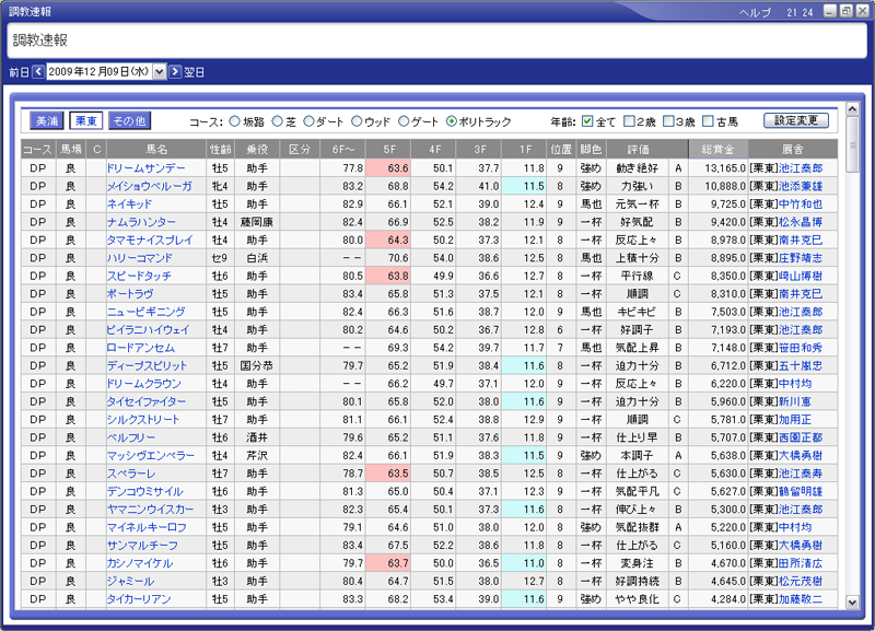 狙っている馬の調子もPOGや一口出資馬の状態もバッチリ!全コース・ハロン毎に色づけできるから 「狙える調教の馬」がスグ見つかる!調教予想派の必須アイテムです。まだデビューしていない前の馬の調教だって見られますよ。
