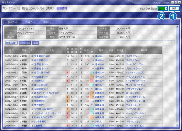 - 馬柱などをクリックすることで表示される各競走馬のデータ画面右上のチェック印を選択し、「登録」ボタンをクリックすることでその馬をチェック馬に登録できます。